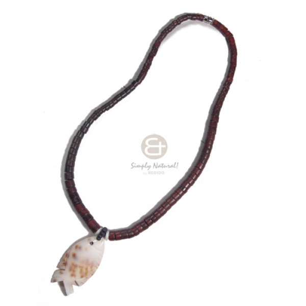 graduated coconut heishi in dark marron tone cowrie tiger shell/50mmx25mm fish design pendant /16in..