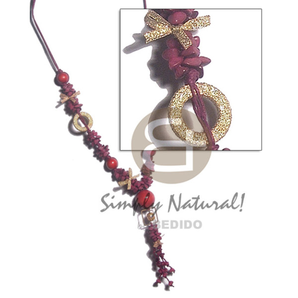4 rows tassled and knotted wax cord buri seed nuggets in plum tones dark red round wood beads, gl..