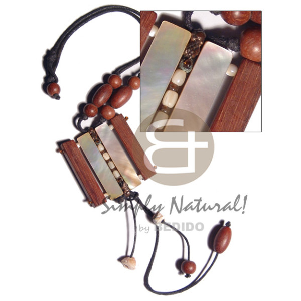 tassled 50mmx12mm bayong wood/MOP resin backing bars,shell beads, wood beads accent in wax cord / 1..