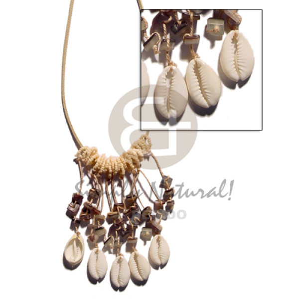 spaghetti choker /dangling sigay & hammershell nuggets on beige leather thong beads..