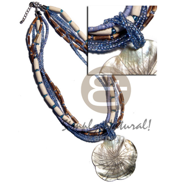 wax cord shell & wood beads accent and 40mmx25mm oval brownlip pendant inlaid metal ring and resi..
