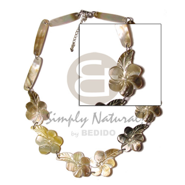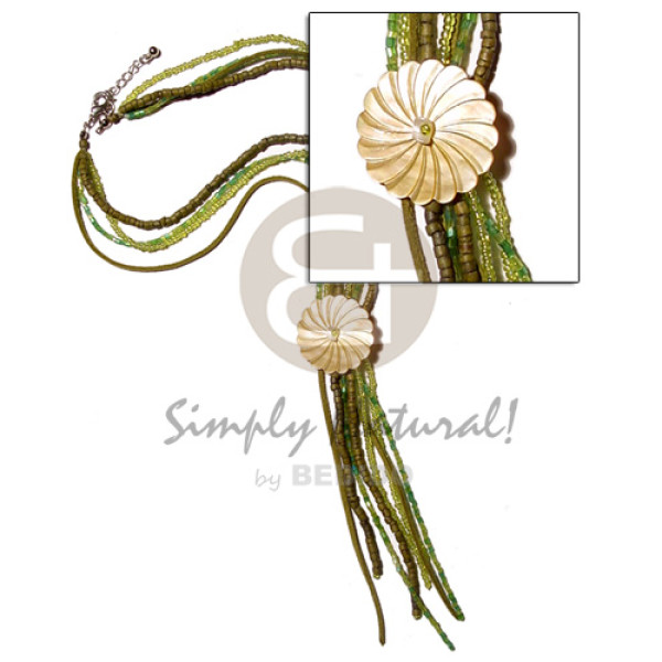 4 layer green tones tassled 2-3mm coconut heishi & glass beads 35mm flower MOP accent..