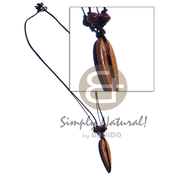 40mmx13mm pointed wooden surfboard fin pendant on wax cord wood beads accent..