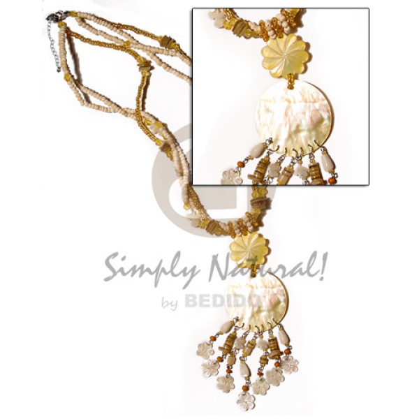 3 rows 2-3mm coconut Pokalet. bleach & glass beads dangling 25mm MOP flower, 40mm MOP round pendant..