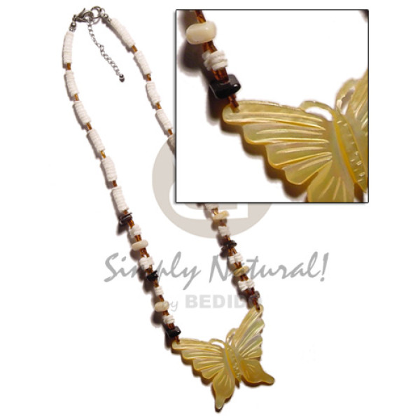 4-5mm white clam shells & glass beads combination & 45mm carved MOP butterfly pendant..