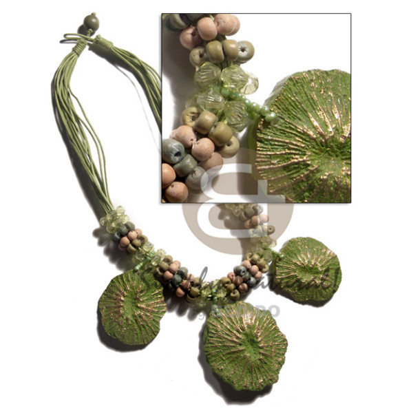 6mm light green wood beads 13mm laminated flat round kabibe shells in olive green tones / barrel lo..