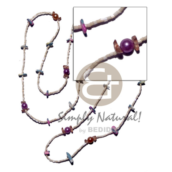 2-3 heishi tiger dangling bleach wood beads/ sidedrill coco/acrylic crystals-ext. chain..
