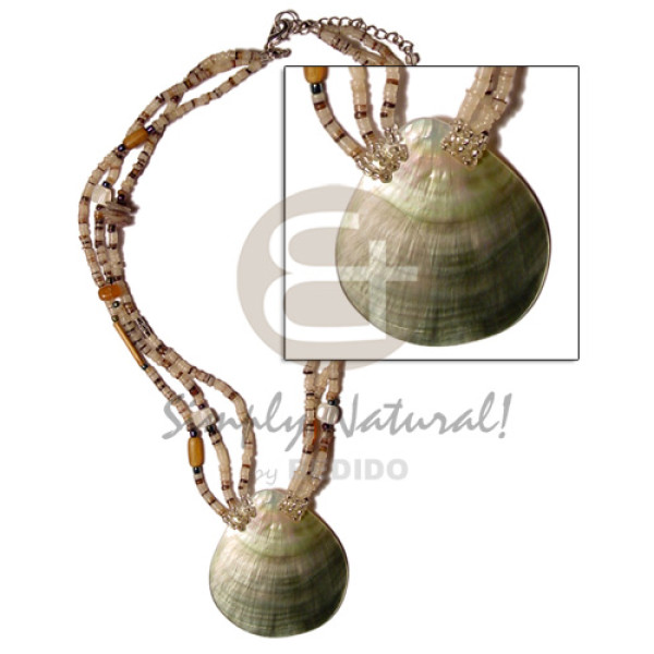 45mm blacklip pendant 3 rows 4-5mm hammershell heishi & horn beads accent..