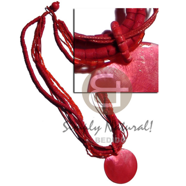 6 rows-2-3mm red tones coconut heishe, glass beads & wax cord neckline 40mm round matching hammers..
