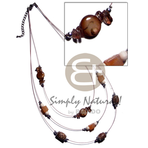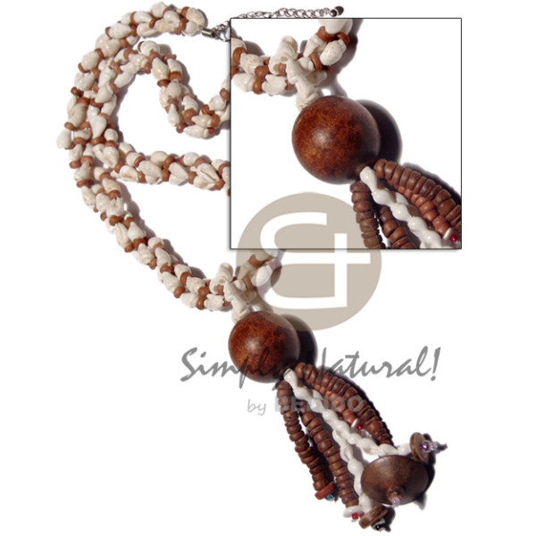 round woods beads brown kukui nuts, coconut sticks, buri tiger seed and dangling graduated dyed nat..