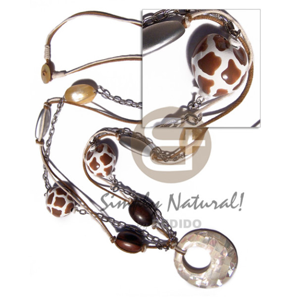 2 layers knotted wax cord metal chain combination, wood beads, gold mouth shell and animal print ku..