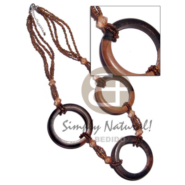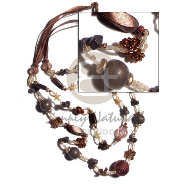 2 layers in graduated rows 34in/28in. bronze tone asstd. wood beads, wrapped and crystal accent go..