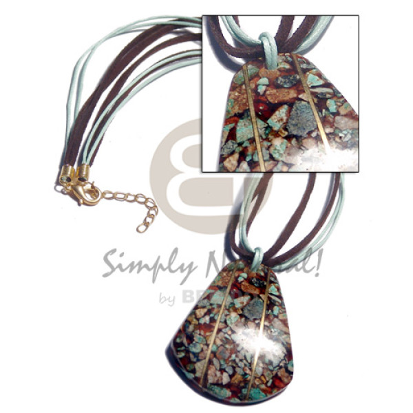 3 layers brown/mint green wax cord/leather combination crushed limestones in 55mmx45mm resin pendan..