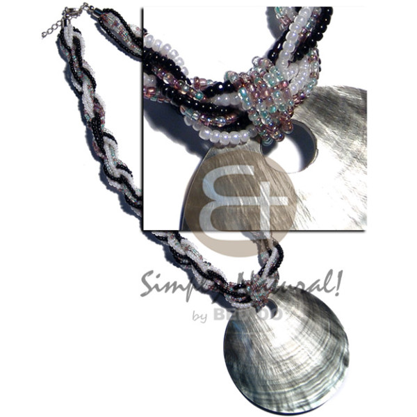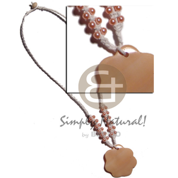 knotted wax cord buri seeds & shell beads & inlaid dolphin hamershell round 40mm pendant..