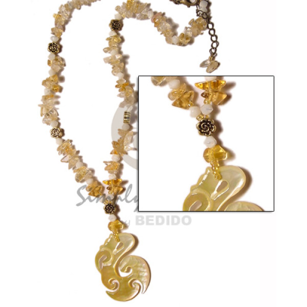 clear stone crystals in yellow gold tones troca beads and 40mmx25mm celtic MOP pendant..