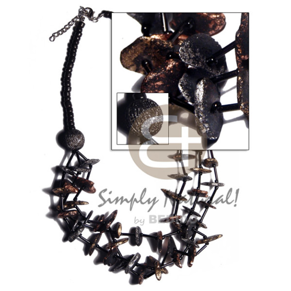 3 rows sig-id, black coconut chips, 15mm coconut center drill, black coconut heishe, woods beads com..