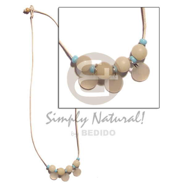 asstd wood beads in 2 rows wax cord 20mm wrapped wood bead and 2.5 in. tassles / aquamarine tones..