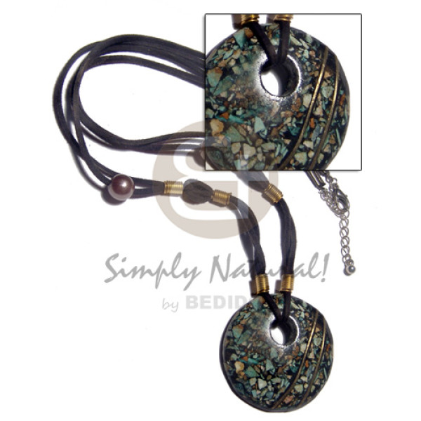 40mm crushed limestones brasswire pendant on black leather thong..