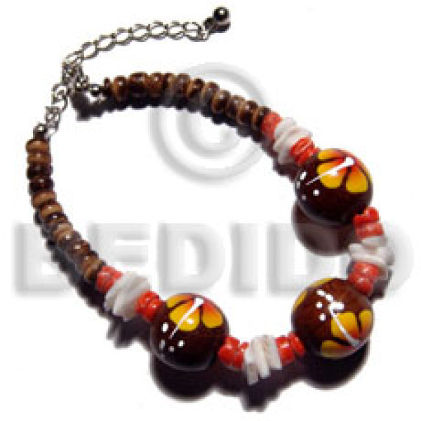 4-5mm coconut Pokalet. nat. brown handpainted 15mm robles round wood beads & white rose shell accen..